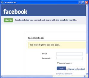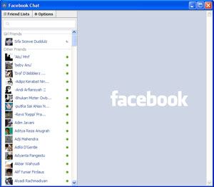 Buat teman-teman yang hobby chating, YM dan Facebook di antaranya, sekarang ada juga Facebook Chat. Hampir sama seperti Yahoo Messenger. Facebook Chat ini berbentuk Software. Software ini memberi keleluasaan chating yang lebih mudah dari pada chating facebook seperti biasanya. Untuk menggunakan kalian tinggal instal saja. Lalu tinggal klik icon facebook chat, lalu muncullah halaman Login. masukkan email address dan facebook password kalian seperti biasanya. dan selanjutnya akan muncul halaman chating seperti gambar dibawah